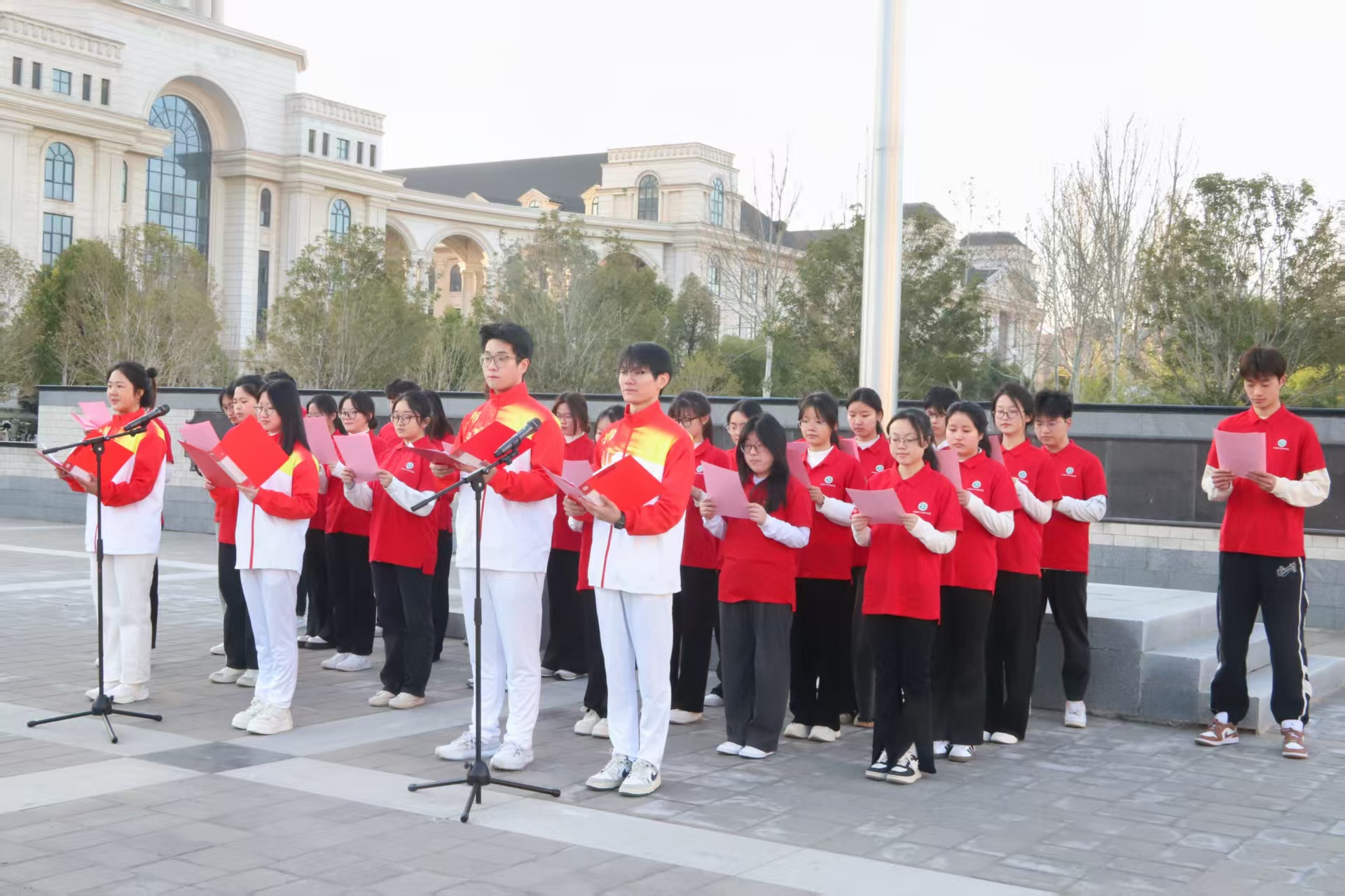 于龙子湖校区中心广场举行“青春心向党,喜迎党代会”升国旗仪式。学院龙子湖校区全体师生参加本次升旗仪式。升旗仪式由学院党委副书记王娟主持。