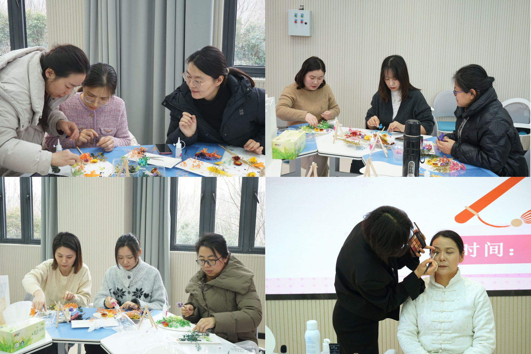在团扇制作环节,花艺师讲解了构图、配色与粘贴等制作技巧。老师们化身“设计师”,以团扇为纸,以干花为笔,精心设计、细致描绘,将心中明媚的春日妆点到扇面之中,大家互相交流配色心得,现场欢声笑语。