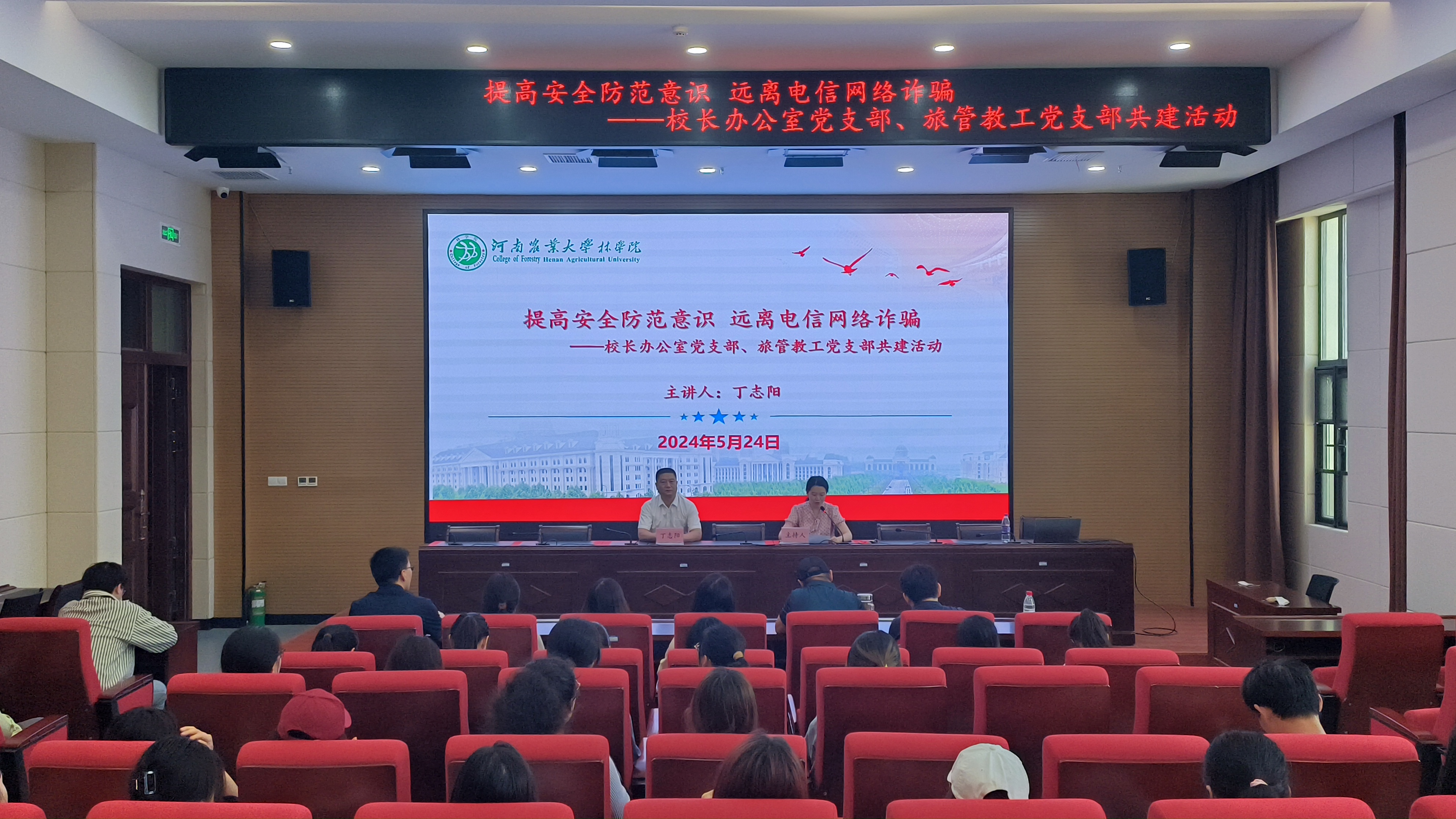 旅管教职工党支部于力行楼428报告厅联合开展以“提高安全防范意识,远离电信网络诈骗”为主题的反诈宣传活动,校办副主任周晓,院党委副书记王娟,学院旅游管理系全体教职工及学生参加,并特邀请郑州市公安局民警、一级警长、一级警督丁志阳主讲,会议由院旅游管理系主任何静主持。