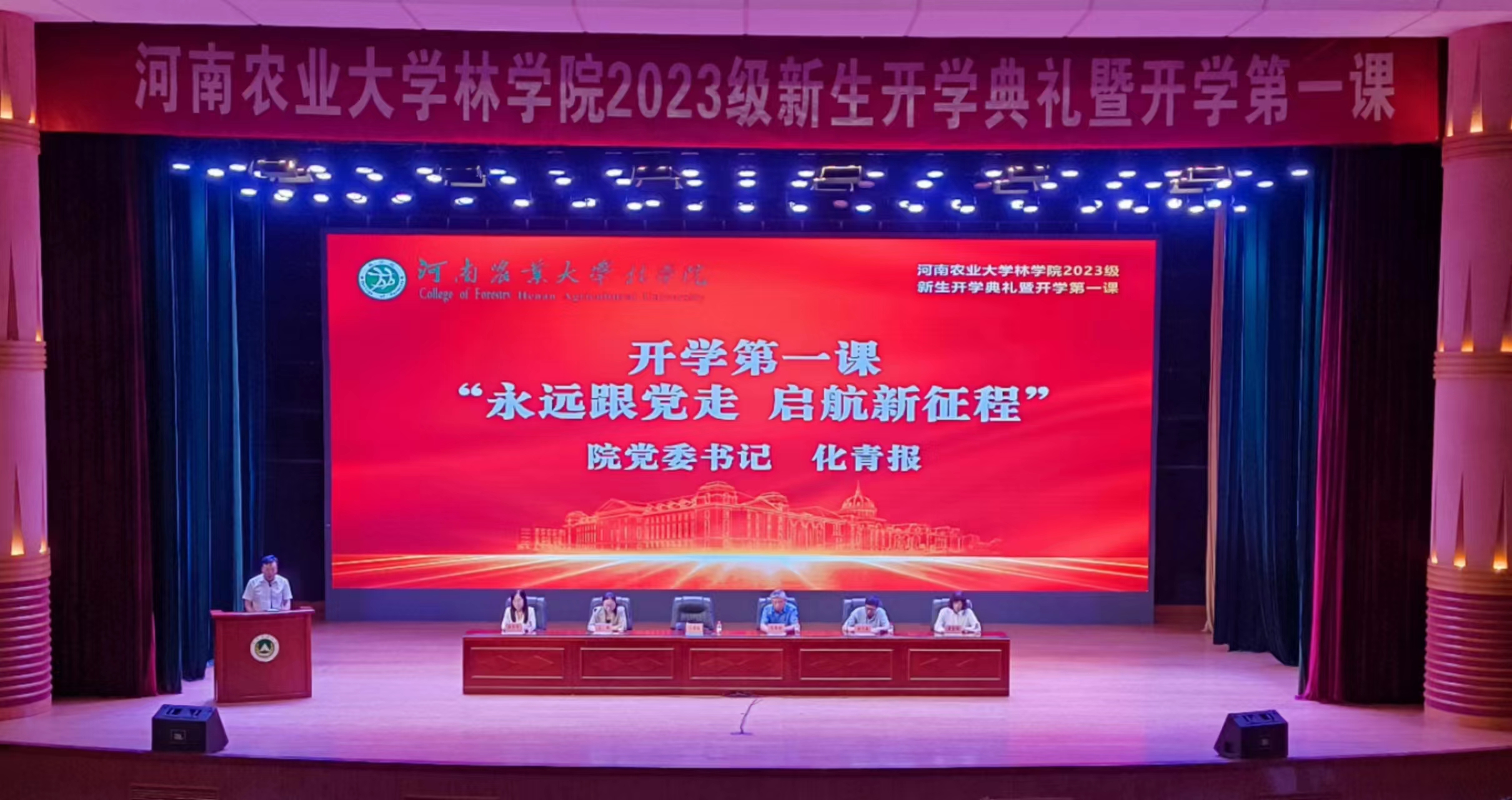 2023级新生开学典礼暨开学第一课,院党委书记化青报,院长范国强,院党委副书记王娟,副院长彭万喜、张学芳、李喜梅,研究生导师代表,新生班主任,辅导员老师及全体2023级新生参加典礼,典礼由王娟主持。