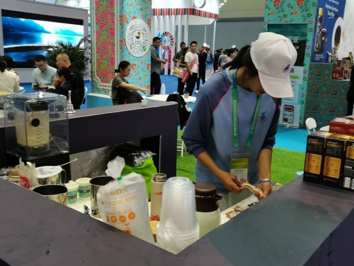 来自av直播 外国语学院的金鑫鑫主要负责郑州会展中心相关展区的产品介绍,如马来西亚的咖啡,有槟州城白咖啡、黑咖啡、卡布奇诺、拿铁、摩卡等,她将这些产品的名字熟记于心,并向顾客介绍咖啡的出售方式、价格等。