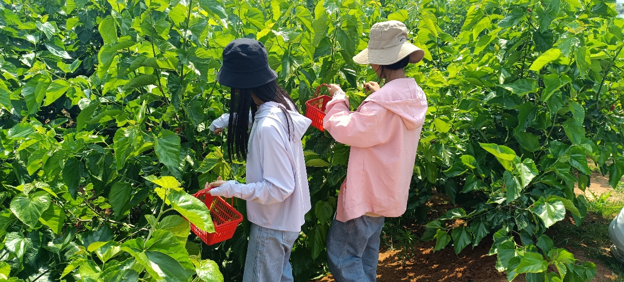 最后,师生一同前往桑葚采摘园,采摘桑葚。
