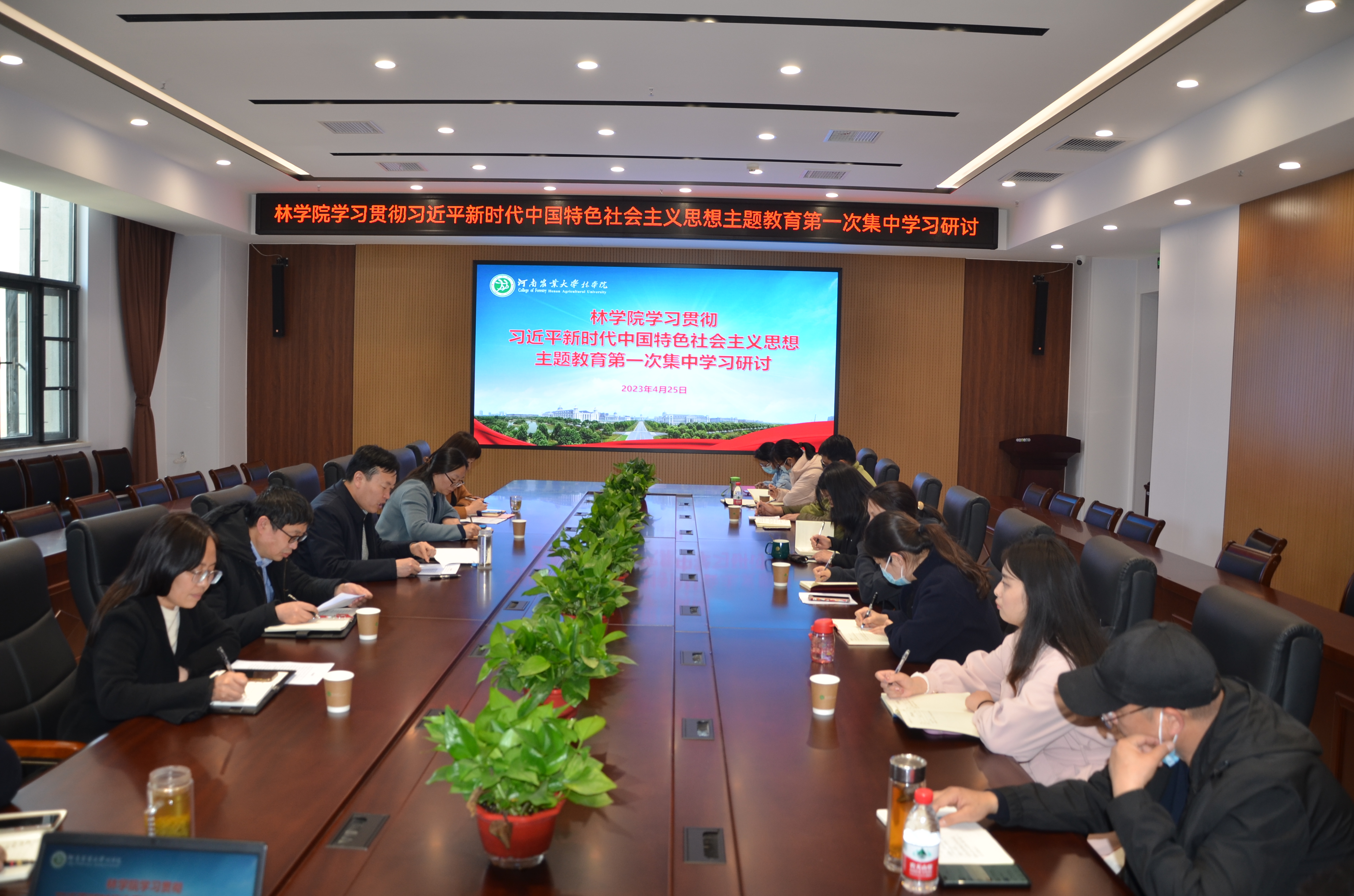 4月25日下午,院党委理论学习中心组在龙子湖校区力行楼231会议室举行学习贯彻习近平新时代中国特色社会主义思想主题教育集体学习(扩大)会议,院党委理论学习中心组全体成员参加会议、学院全体中层干部列席会议。