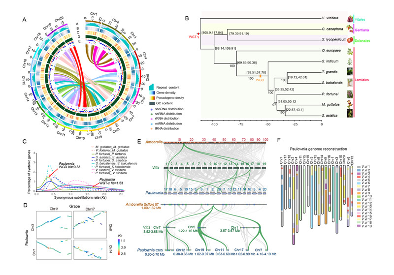 泡桐是我国重要的速生用材树种之一,在保障我国木材安全、改善生态环境和提高人民生活水平等方面具有重要的作用。目前,由于缺乏精准的基因组信息,极大阻碍了泡桐基础生物学研究工作。该研究利用WTDBG软件,三代PacBio测序平台和Hi-C技术成功构建了染色体级别的白花泡桐参考基因组。组装的白花泡桐基因组大小为511.6 M,contig N50为852.4 K,组装覆盖度达到基因组的96.85%,注释蛋白编码基因31,985个。白花泡桐基因组重复序列为50.34%,其中LTR元件占29.5%。泡桐科与透骨草科和列当科进化关系最近,并且有3,022个基因家族发生了扩张。白花泡桐经历了两次全基因组复制事件:一次为古老的共有的全基因组复制事件,另一次为特有的二倍化事件 (图 1),该结果为唇形科植物进化提供了理论依据。