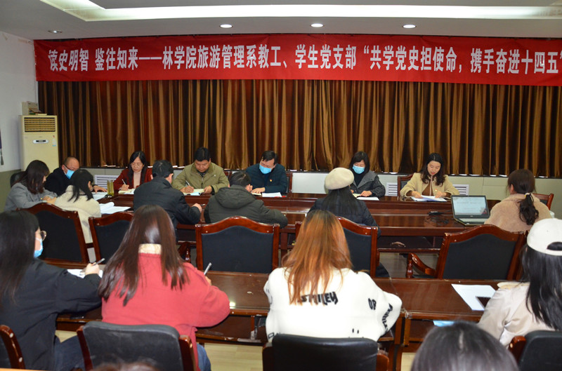 旅游管理系教工、学生党支部在二号楼二楼会议室举共同开展“共学党史担使命,携手奋进十四五”主题活动,研究部署党史学习工作。院党委书记化青报、院党委副书记李兴旺、副院长张学芳、副院长李喜梅,全体旅管系教工、学生党员参加活动。