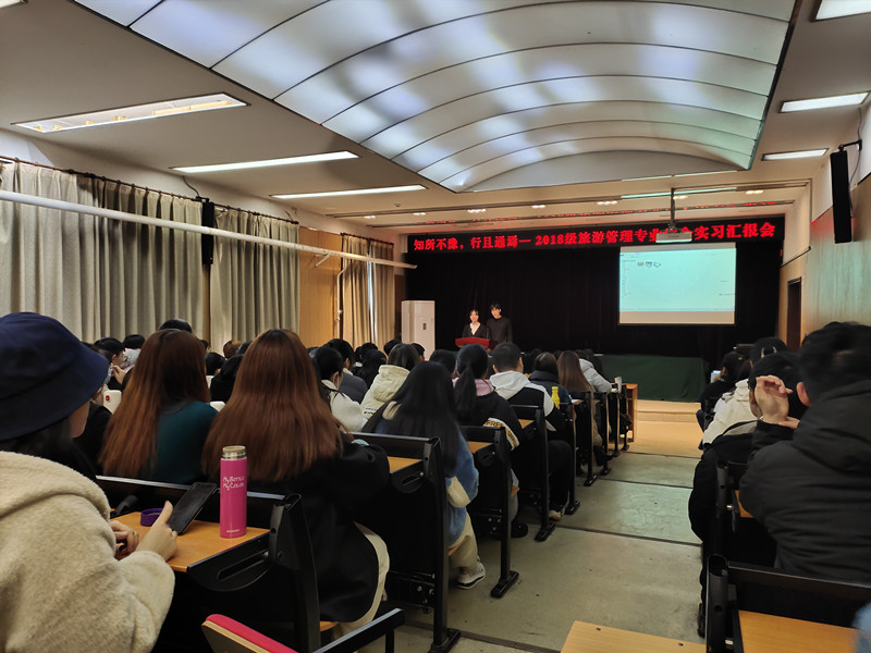2018级旅游管理专业综合实习汇报会在2号楼四楼学术报告厅举行。院党委副书记李兴旺,副院长彭万喜,旅游管理专业教师朱玉芳、何静、张龙冲、李志等,以及专业全体学生参加了此次汇报会。