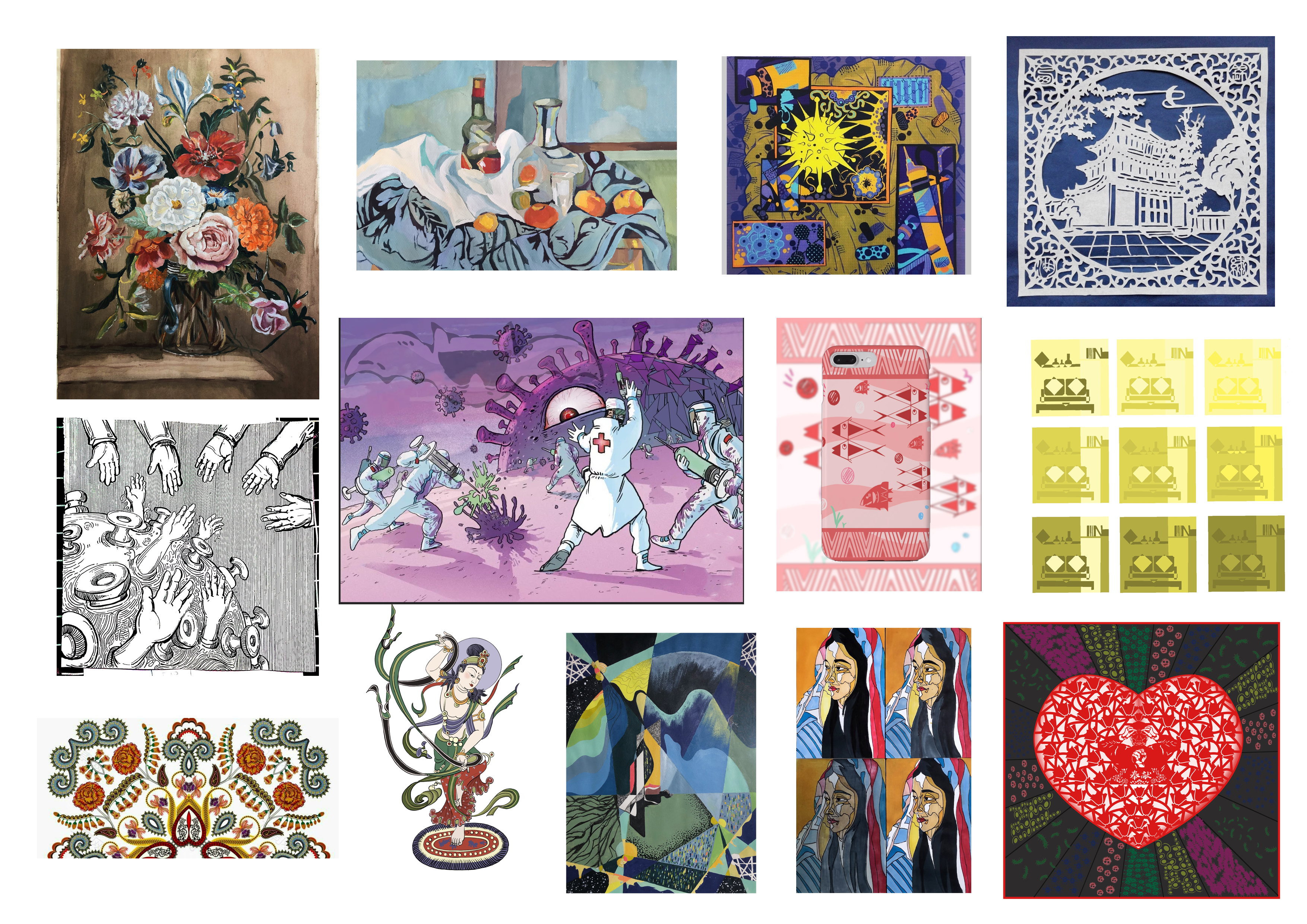 家中的网络和画画条件自然不比学校来的方便,往日校园里浓厚的艺术氛围和熏陶也不复存在。王娜老师根据学生居家现有条件,及时对课程的实践方式和内容做出了合理调整。她在原有的教学内容基础上进行修改和补充,收集整理了大量新鲜资料和多媒体内容,以便于同学们截图下载,课后消化。课堂上王娜老师采用发布教学任务及课件,并通过网络平台完成学生签到环节,同时,她还采用微信、QQ媒介进行一对一线上指导,不论是学生的创作草图还是完结的终稿设计,她都耐心细致地参与研讨和指导,增加了很多线上讨论。王娜老师还将课堂训练进行了严密的设定,每周布置本周训练课题,以目标驱动实践。她还结合当下疫情的暖心故事,激发学生的创意,提升同学们的专业热情,也让学生们看到在这个特殊的时间空间,依然可以寻得一番趣味。