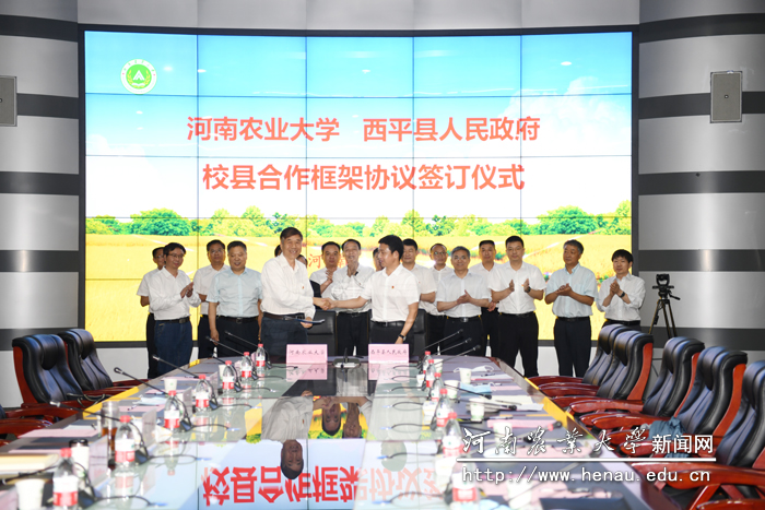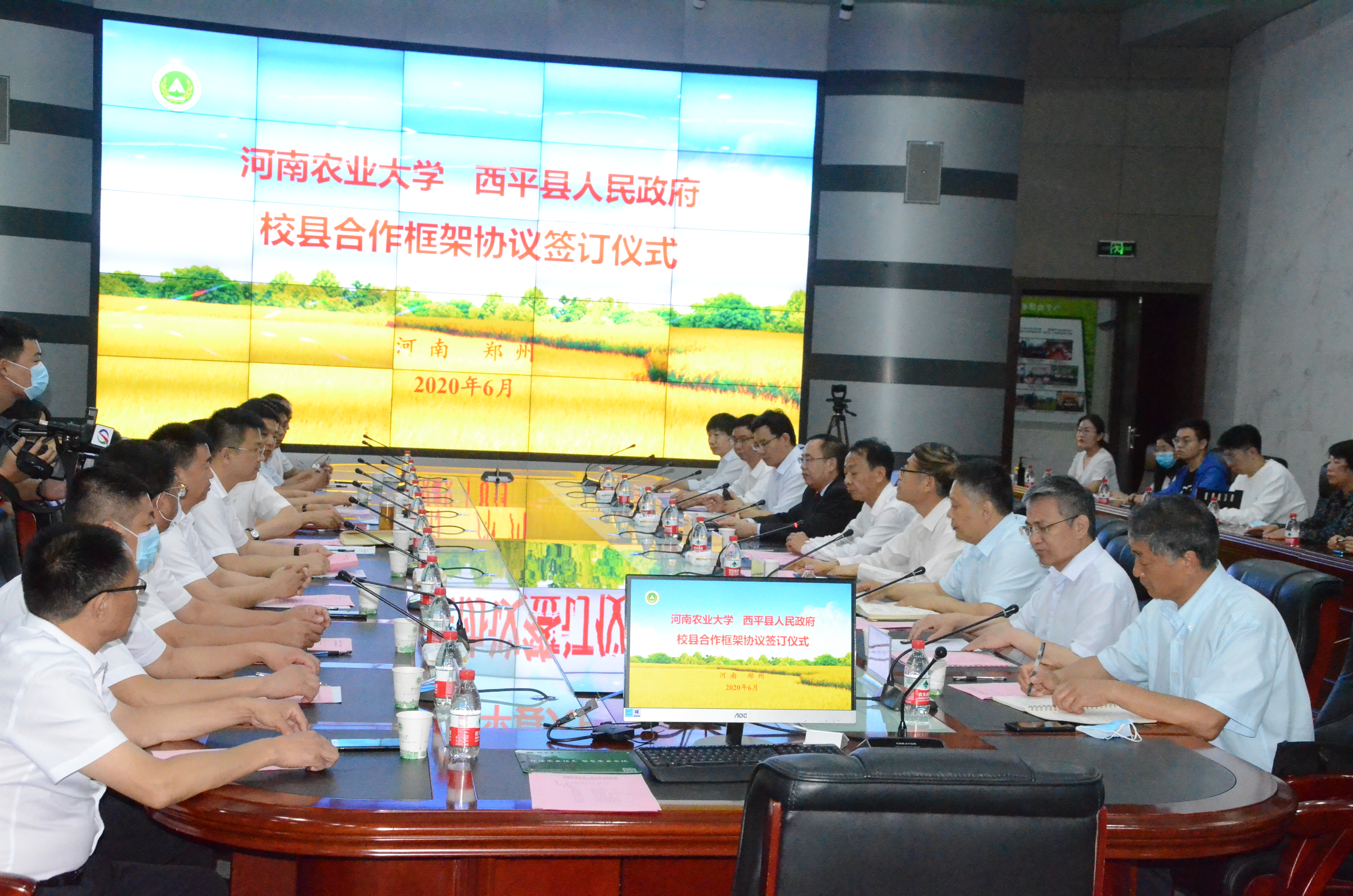 与西平县人民政府校地合作框架协议签订仪式在中原农村信息港一楼大厅举行。西平县委书记聂晓光,县长李全喜,县委副书记,县委常委组织部长,县委常委宣传部长、副县长、县政协副主席,以及县农业农村局、自然资源局、城市管理局、林业发展服务中心等有关部门负责人,av直播