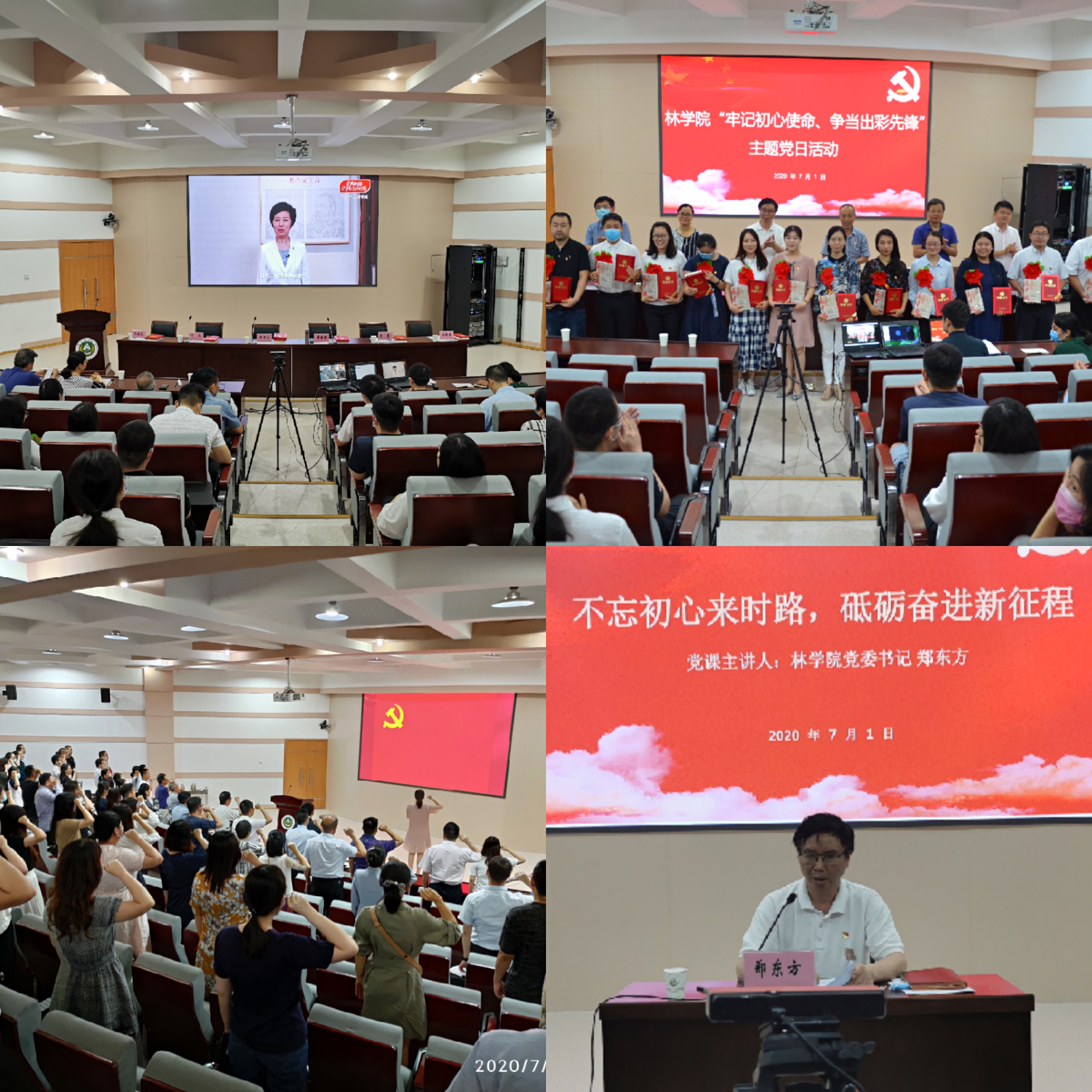 党委2019-2020年在“不忘初心、牢记使命”主题教育和新冠肺炎疫情防控中,涌现出的先进集体和先进个人。随后,七位优秀共产党员代表分享了各自在疫情防控期间,坚守科研、教学、社区、校园的感人事迹,他们舍小家顾大家、冲锋在前、勇挑重担、甘于奉献的事迹让现场的师生感动地潸然泪下,赢得了阵阵掌声。院关工委党建组织员李世国对青年教师党员的事迹给予高度赞扬,肯定了他们对学院各项事业发展做出的积极贡献。“听了老师们的事迹分享,我很感动,不管是在居住区做志愿者还是为毕业生整理行李,老师们始终坚守岗位,默默奉献,这种精神值得我们学习”,研究生第三党支部书记袁德强在家观看直播后这样说。接下来,全体党员精神饱满、高举右拳,重温入党誓词。最后,院党委书记郑东方代表院党委向全体党员致以节日问候,他以《不忘初心来时路、砥砺奋进新征程》为题为全体党员上党课,深刻阐释了习总书记关于教育的重要论述。他指出,教师党员要贯彻落实立德树人根本任务,不忘初心、牢记使命,更加有效地把党员组织起来、把人才凝聚起来,以党建高质量推动学院事业发展高质量。
