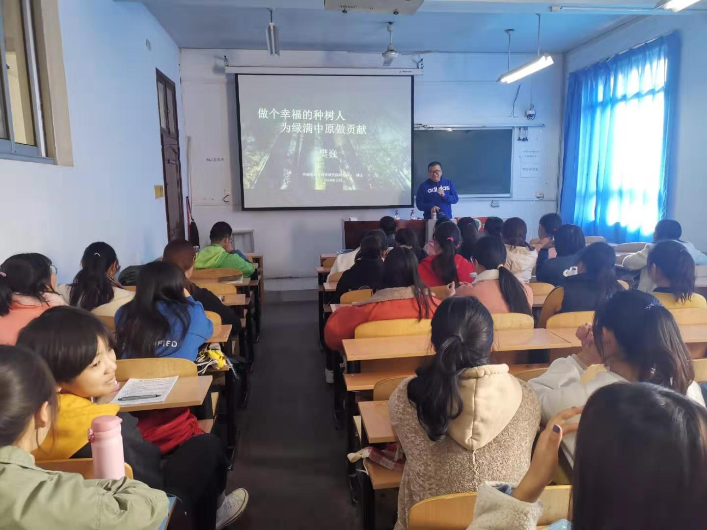 11月19日下午,河南省林业科学研究院樊巍研究员为av直播 林学专业师生做了题为“做个幸福的种树人,为绿满中原做贡献”的报告。