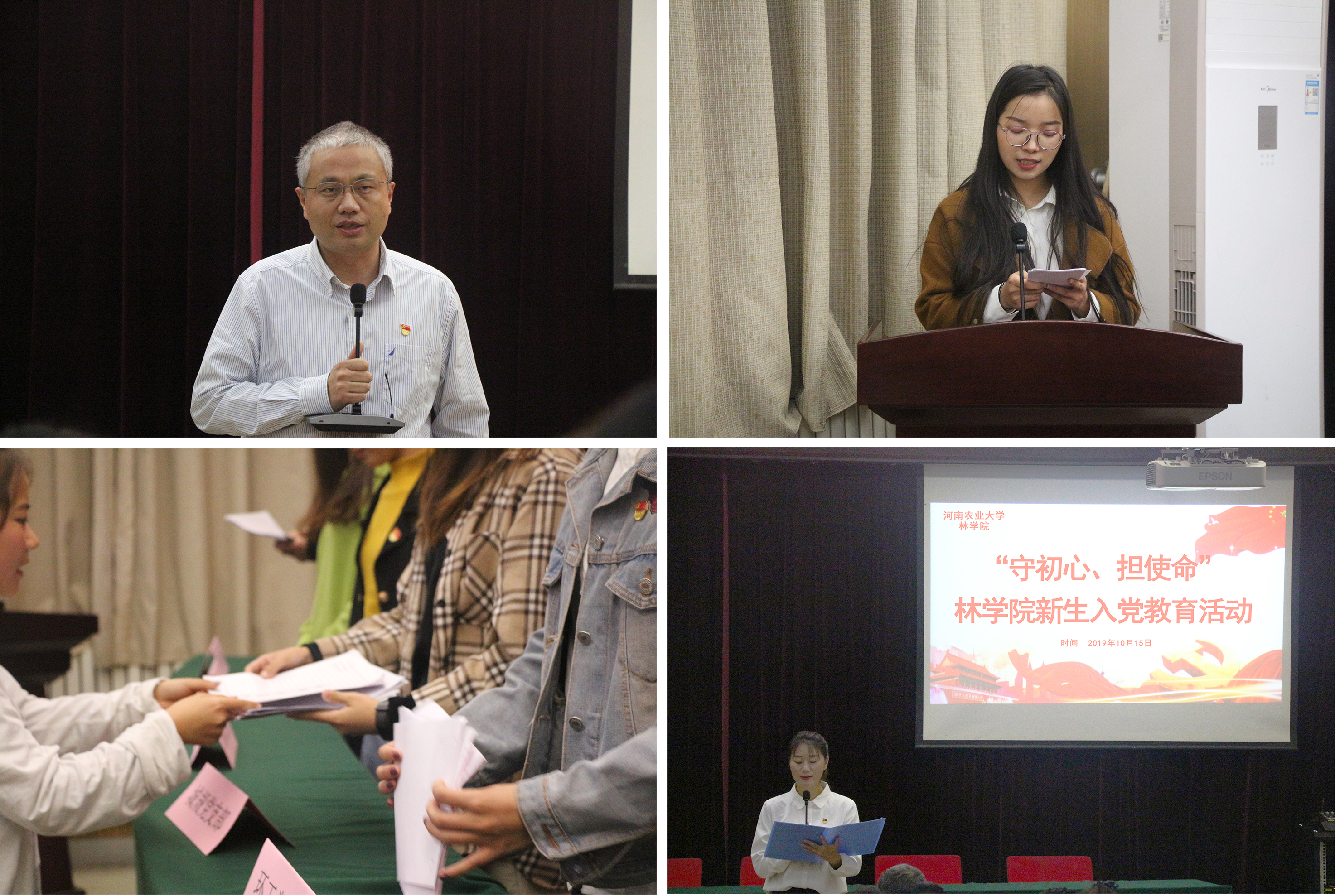 为推进主题教育深入开展,进一步强化青年学子的理想信念,坚定入党初心,激发爱国爱党热情,10月15日晚,av直播 在2号楼4楼报告厅举行“守初心,担使命”新生入党教育活动。林学系教工党员李继东、院团委老师刘洋、各学生党支部书记、百余名新生代表参加活动。