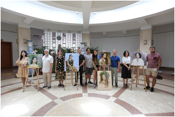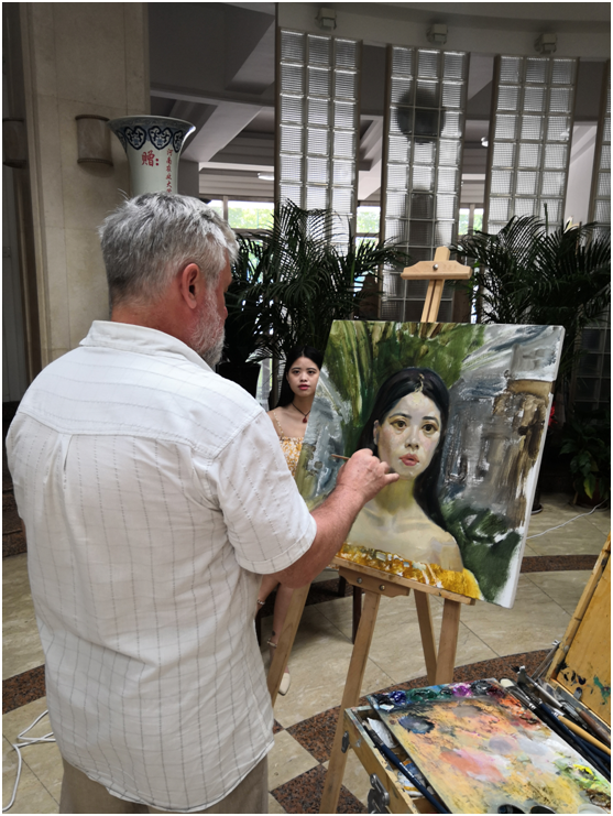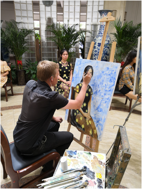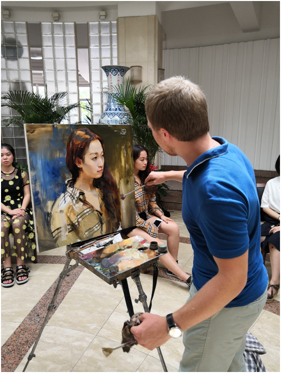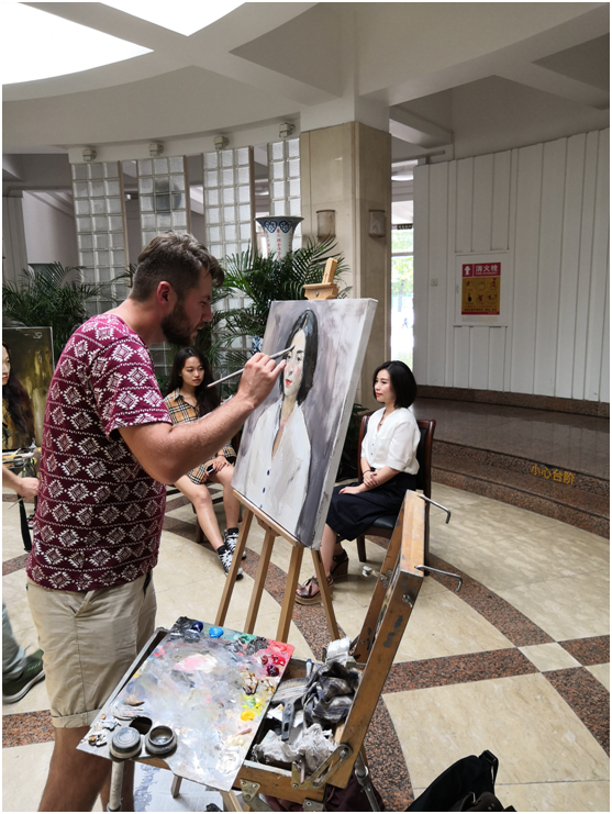 9月3日上午,俄罗斯功勋艺术家亚历山大·伊万诺夫带领列宾美院三名学生在三百人报告厅天光休息区为av直播
