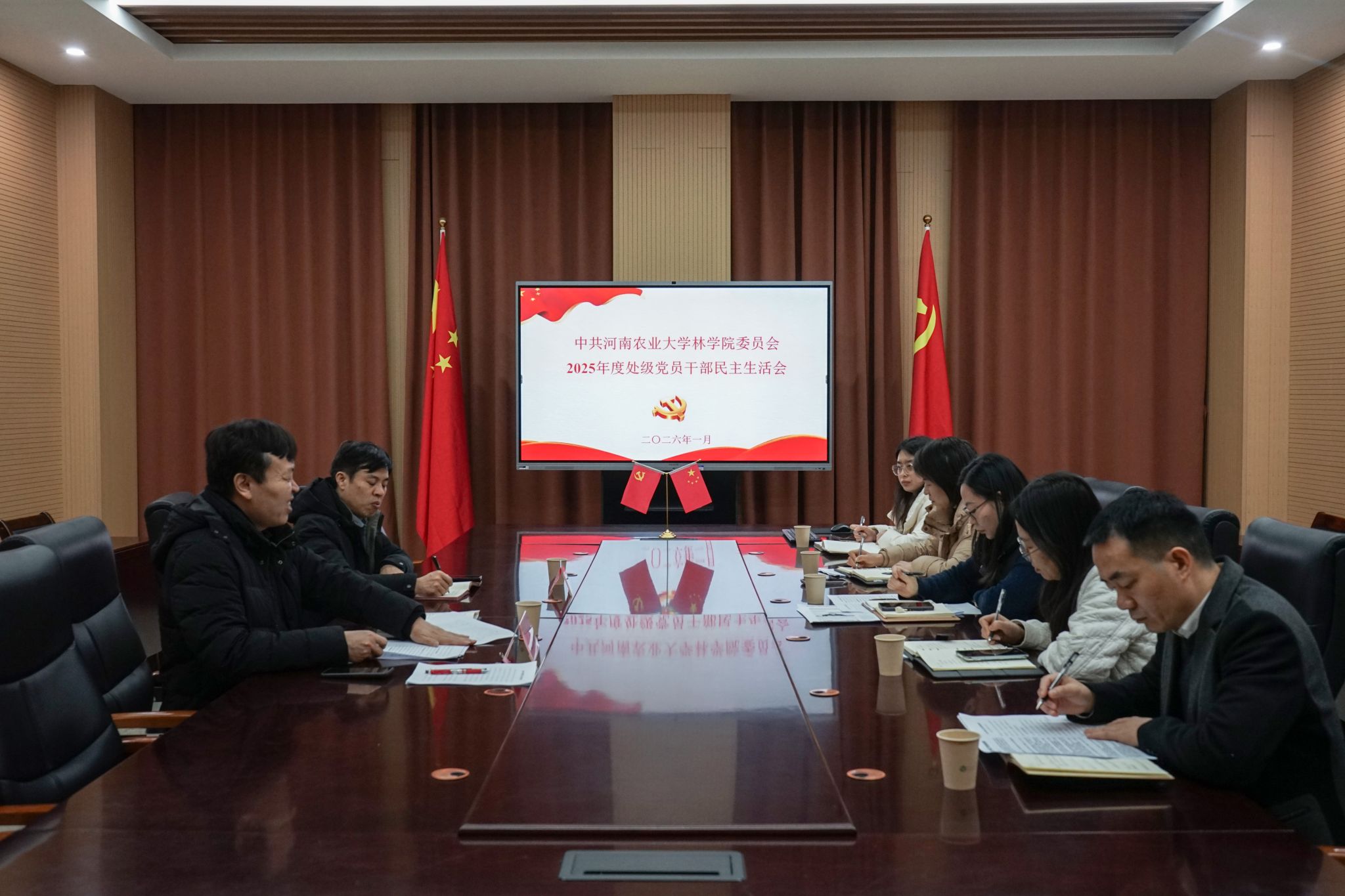于龙子湖校区力行楼南244会议室召开2025年度处级党员干部民主生活会。学院处级党员领导干部、党委委员参加会议,校党委组织部副部长史军伟列席指导。会议由院党委书记化青报主持。