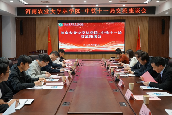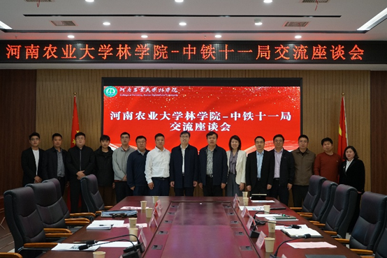 于力行楼南-231召开学院与中铁十一局集团建筑安装工程有限公司交流座谈会。社会科学处处长何泽军、党委书记化青报、副院长李喜梅、副院长赵振利、经济与管理学院农业经济系主任吴强、林学系主任闫东锋等相关人员及中铁十一局集团建筑安装工程有限公司副总经理李希恒、新质生产力中心主任黄言初、副主任付弘灏、副主任王乐彬、河南市场总经理董华坤、河南区域经理雷金伟共同出席本次交流活动。座谈会由李喜梅主持。