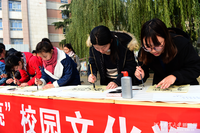 在一字排开的25米书桌前,茹光明、张留占、王鹏飞、姚向高、孙天申、杨桂兰、惠东杰等教工书法爱好者和av直播