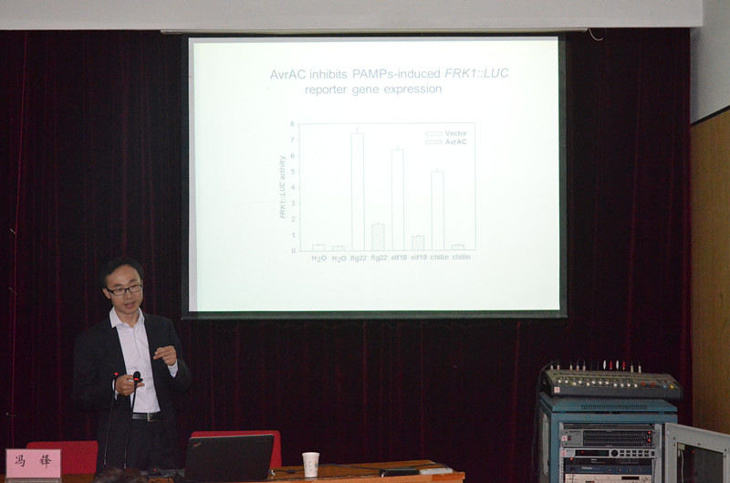 师生作了题目为《病原细菌效应蛋白调节植物天然免疫的分子机理》的学术讲座,报告会由院长杨喜田教授主持。冯峰博士的报告内容主要围绕植物和病原微生物、共生真菌、病原细菌效应蛋白调节、植物天然免疫分子四个部分。