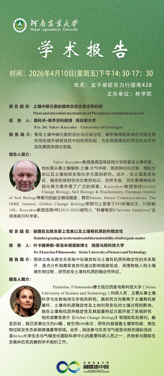 报告人简介:Yakov Kuzyakov教授是德国哥廷根大学的著名土壤学家。他长期从事土壤植物-土壤-大气中碳、氮的转化和迁移、根际生态以及土壤地球生物化学方面的研究。此外,在土壤激发效应、稳定和放射性同位素的标记、自然丰度、同位素稀释和可视化等方面开展了广泛的探索。Kuzyakov教授担任Global Change Biology, Soil Biology & Biochemistry, European Journal of Soil Biology等期刊的副主编或编委,其在Nature, Nature Communications, The ISME Journal, Global Change Biology等期刊上发表了450多篇论文,HI指数108。Kuzyakov教授连续9年(2015-2023)被列入“科睿唯安(Clarivate Analytics)”全球高被引科学家。